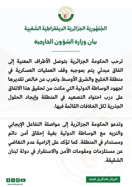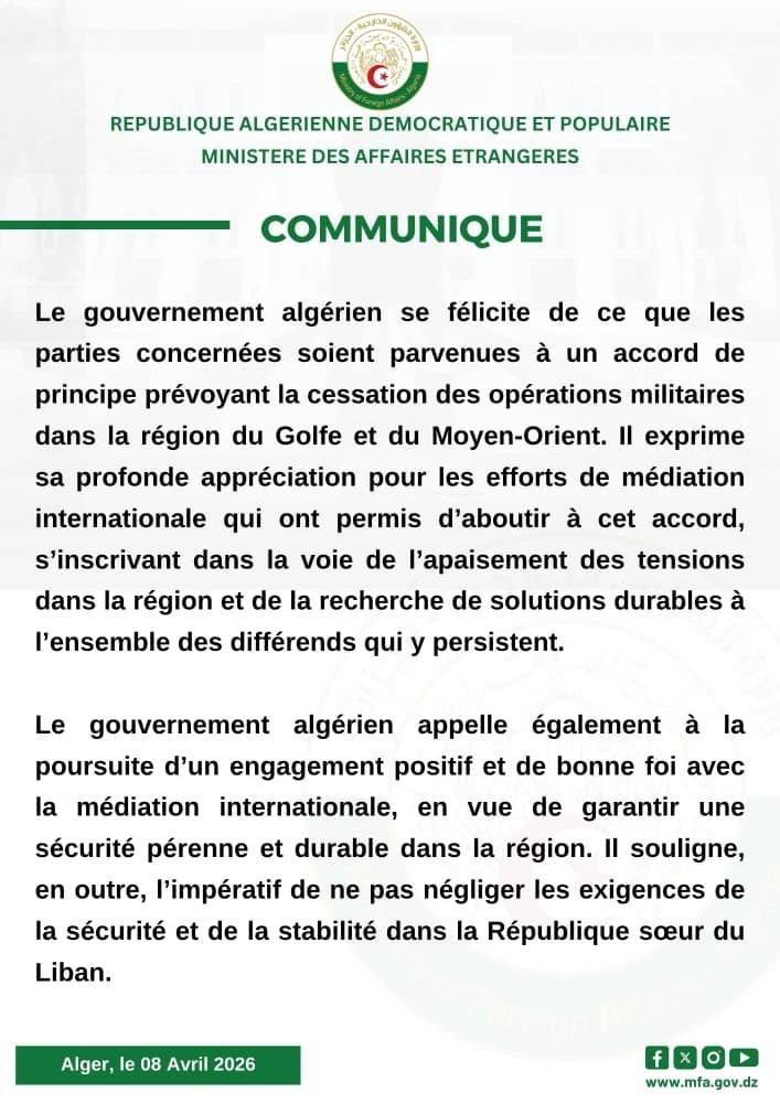 بيان وزارة الشؤون الخارجية – Communiqué du Ministère des Affaires étrangères 08/04/2026