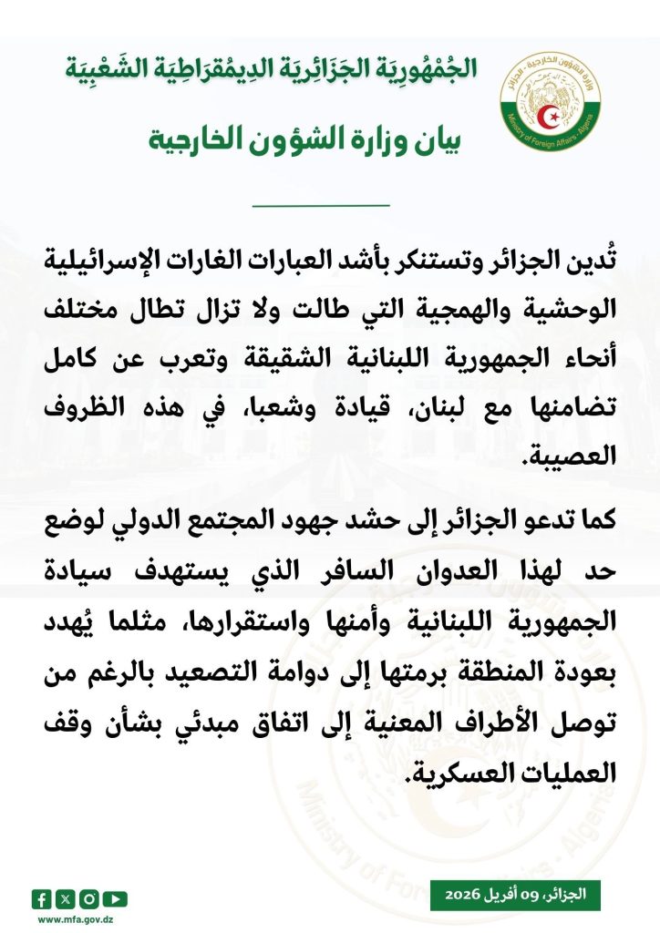 Communiqué du Ministère des Affaires étrangères 09/04/2026 : L’Algérie condamne avec la plus grande fermeté les frappes israéliennes barbares et sauvages sur le Liban