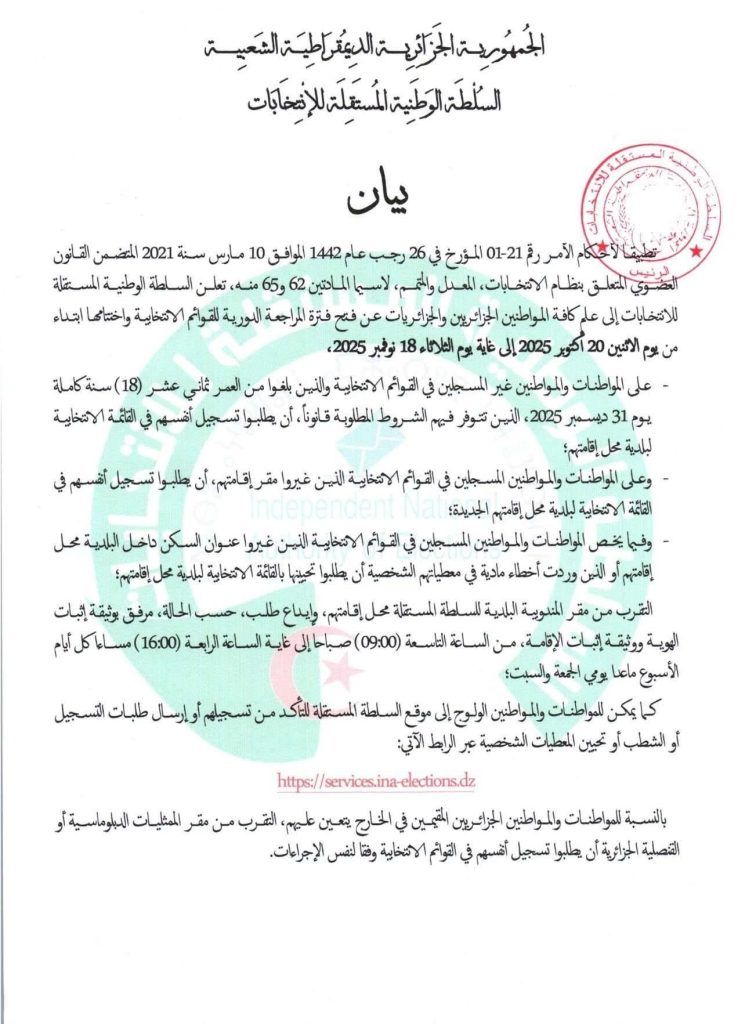 OUVERTURE DE LA PÉRIODE DE RÉVISION PERIODIQUE DES LISTES ÉLECTORALES DU 20 OCTOBRE 2025 AU 18 NO [...]
