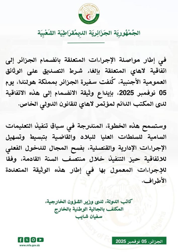 Communiqué du ministère des Affaires étrangères – Convention de La Haye abrogeant la légalisation des documents publics étrangers 05/11/2025.