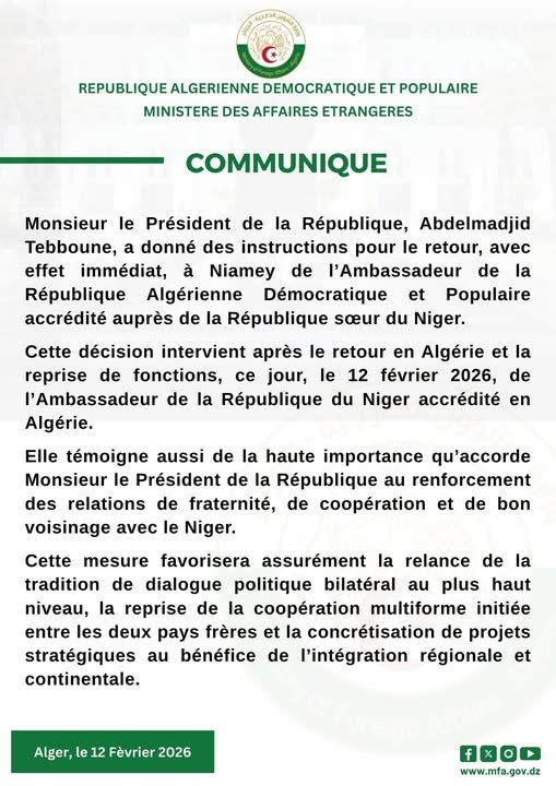 communiqué du Ministère des Affaires étrangères – Niger – 12/02/2026